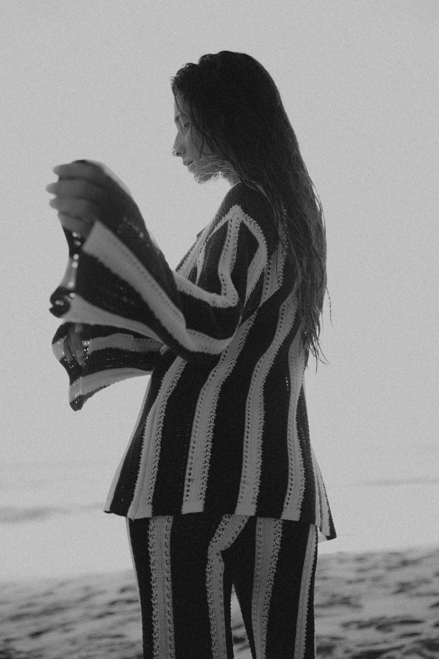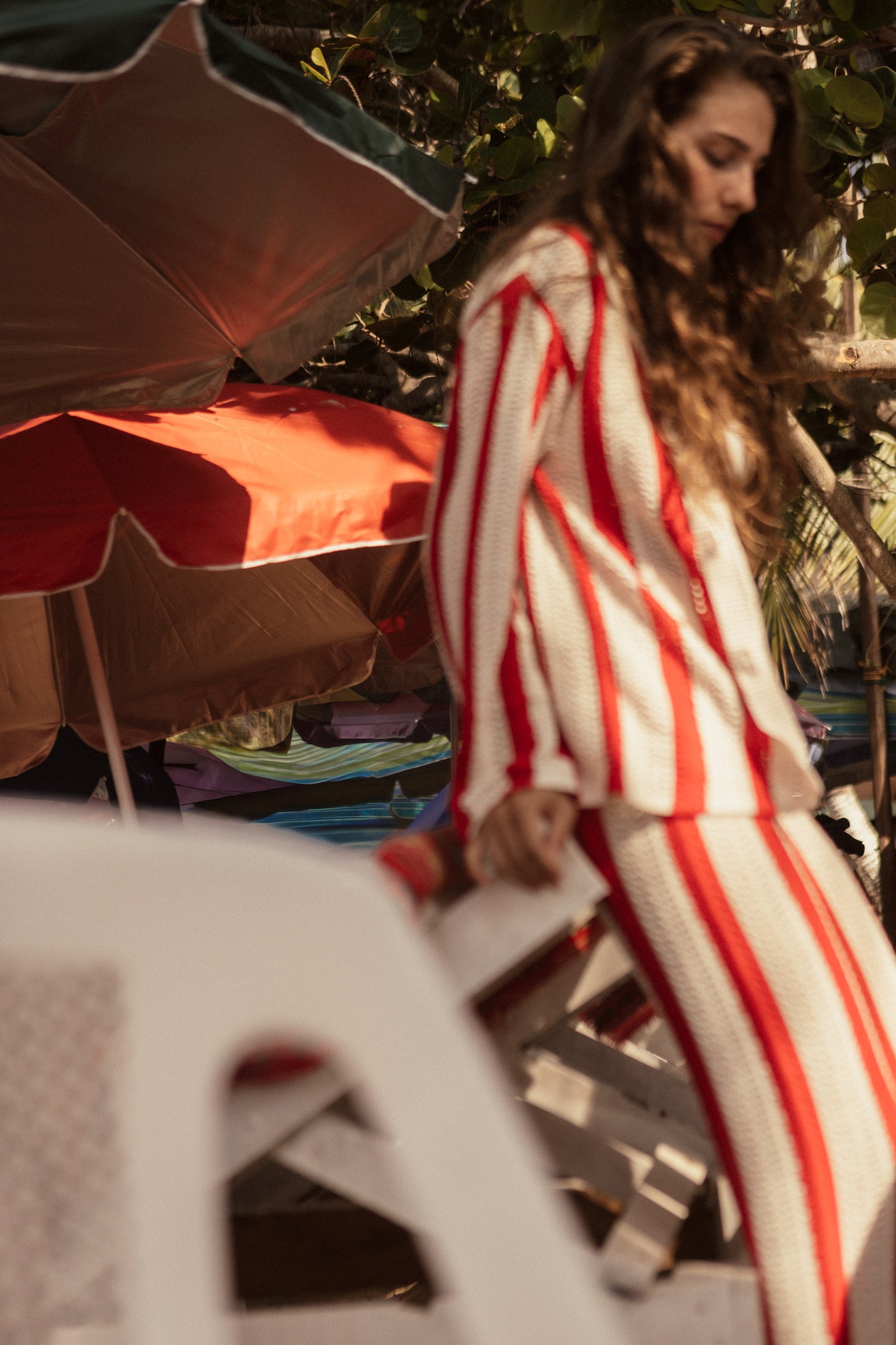Pantalón ligero y fluido, tejido en punto con textura suave, ideal para climas cálidos .Diseñado en rojo y hueso con tiro medio y un resorte completo en la cintura, ofrece un ajuste cómodo y favorecedor que se adapta al cuerpo. La pierna acampanada crea un movimiento elegante y relajado