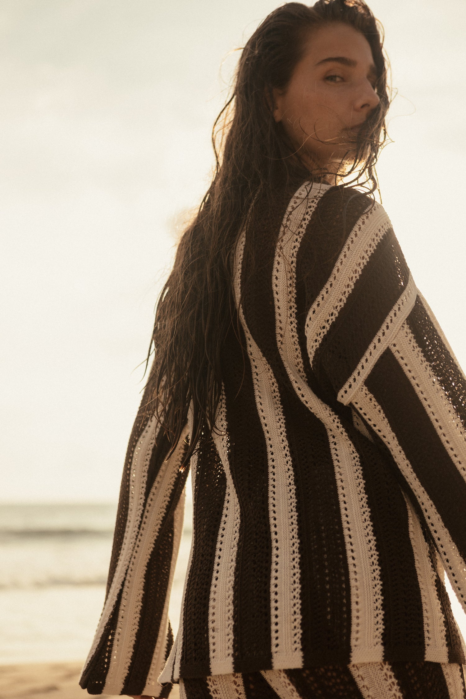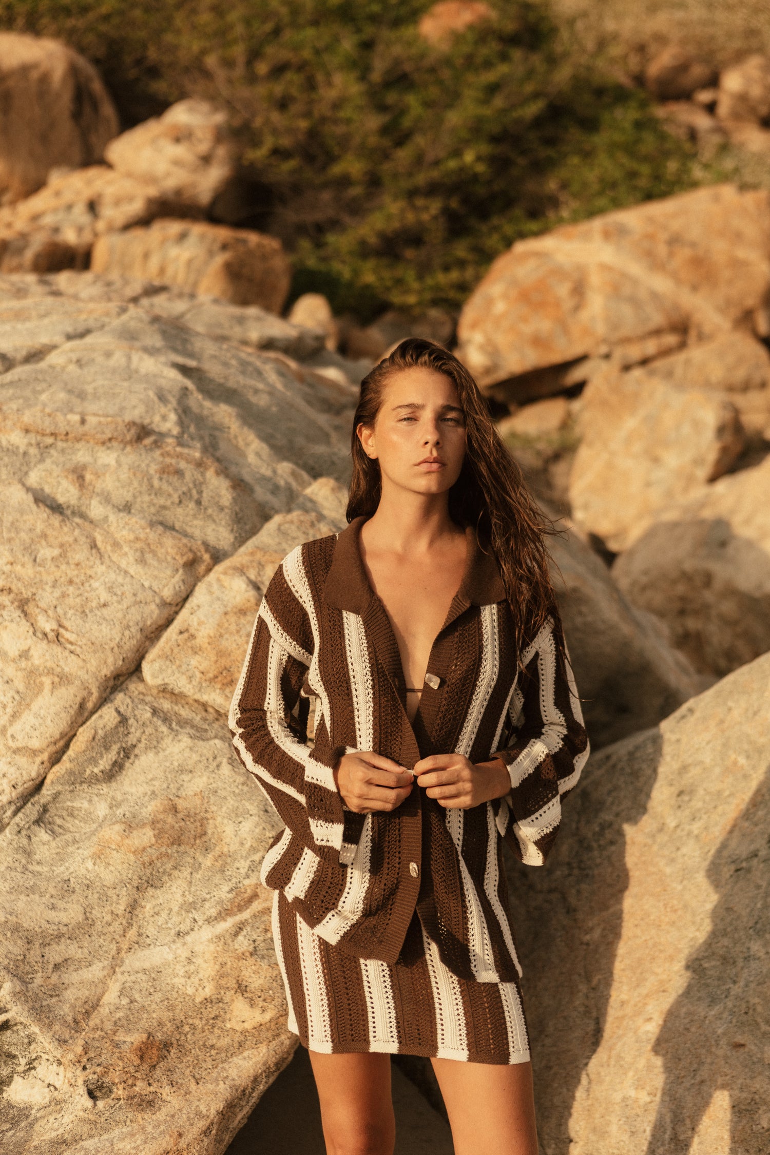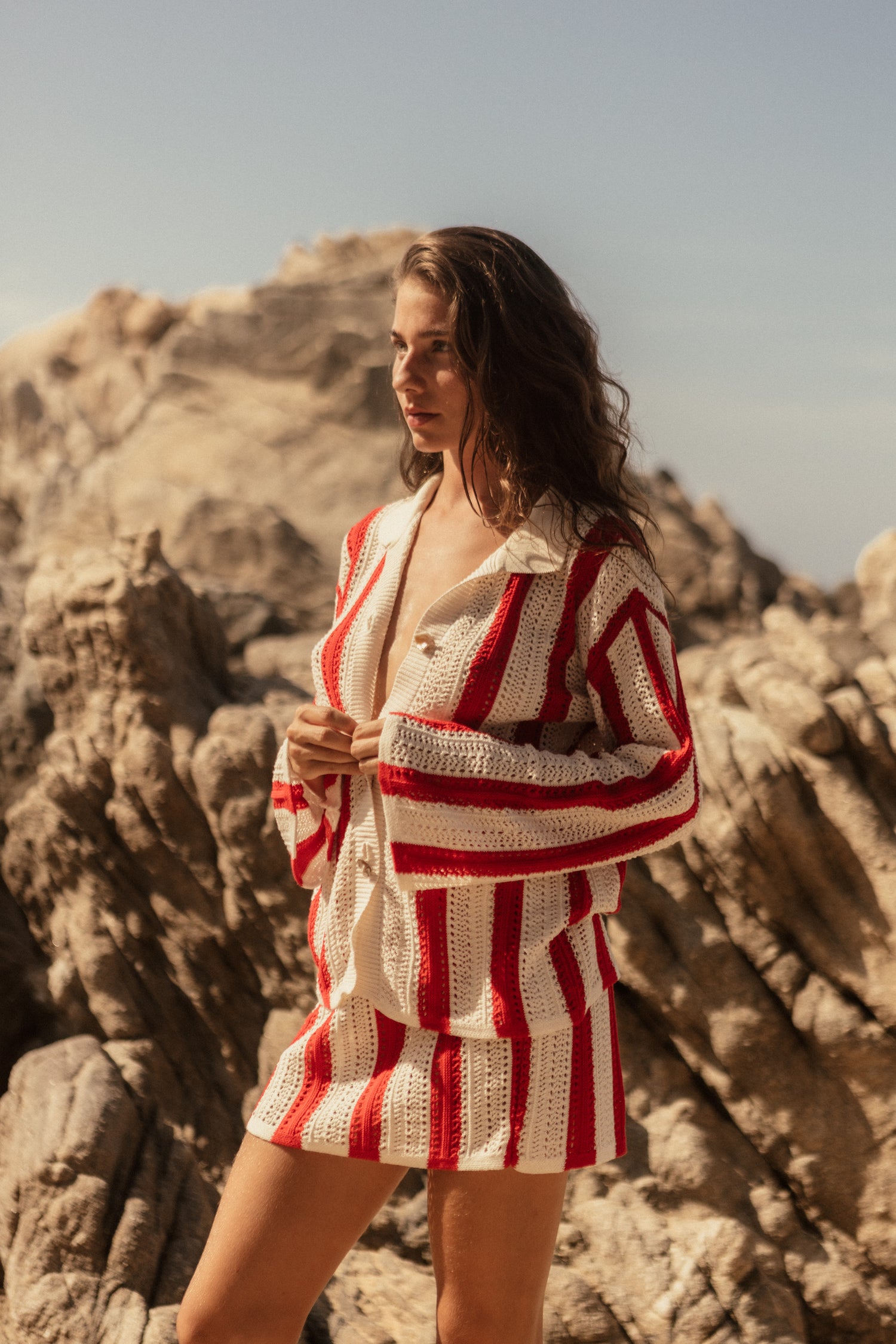 Un blazer ligero y sofisticado, tejido en punto con una caída suave y fresca. Diseño de rayas en rojo y hueso evoca la esencia vibrante del verano eterno. Con manga larga acampanada y un fit relajado, esta pieza abraza el cuerpo con comodidad sin perder elegancia. Al frente, tres botones de concha natural irregular Un blazer pensado para acompañarte desde escapadas costeras hasta cenas al atardecer. Atemporal y fresco.